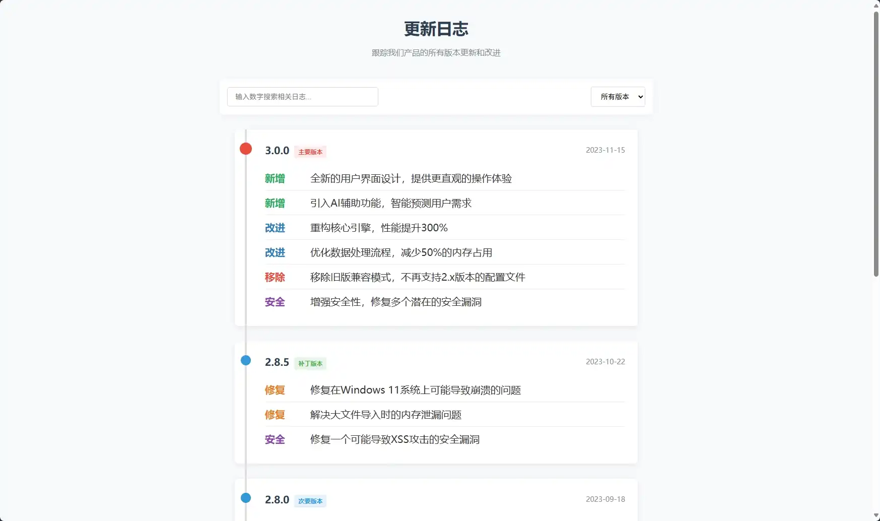这是一个用于展示软件版本更新历史的网页应用,采用纯前端实现,具有现代化的UI设计和交互体验。该应用通过Fetch API从外部JSON文件加载数据.
