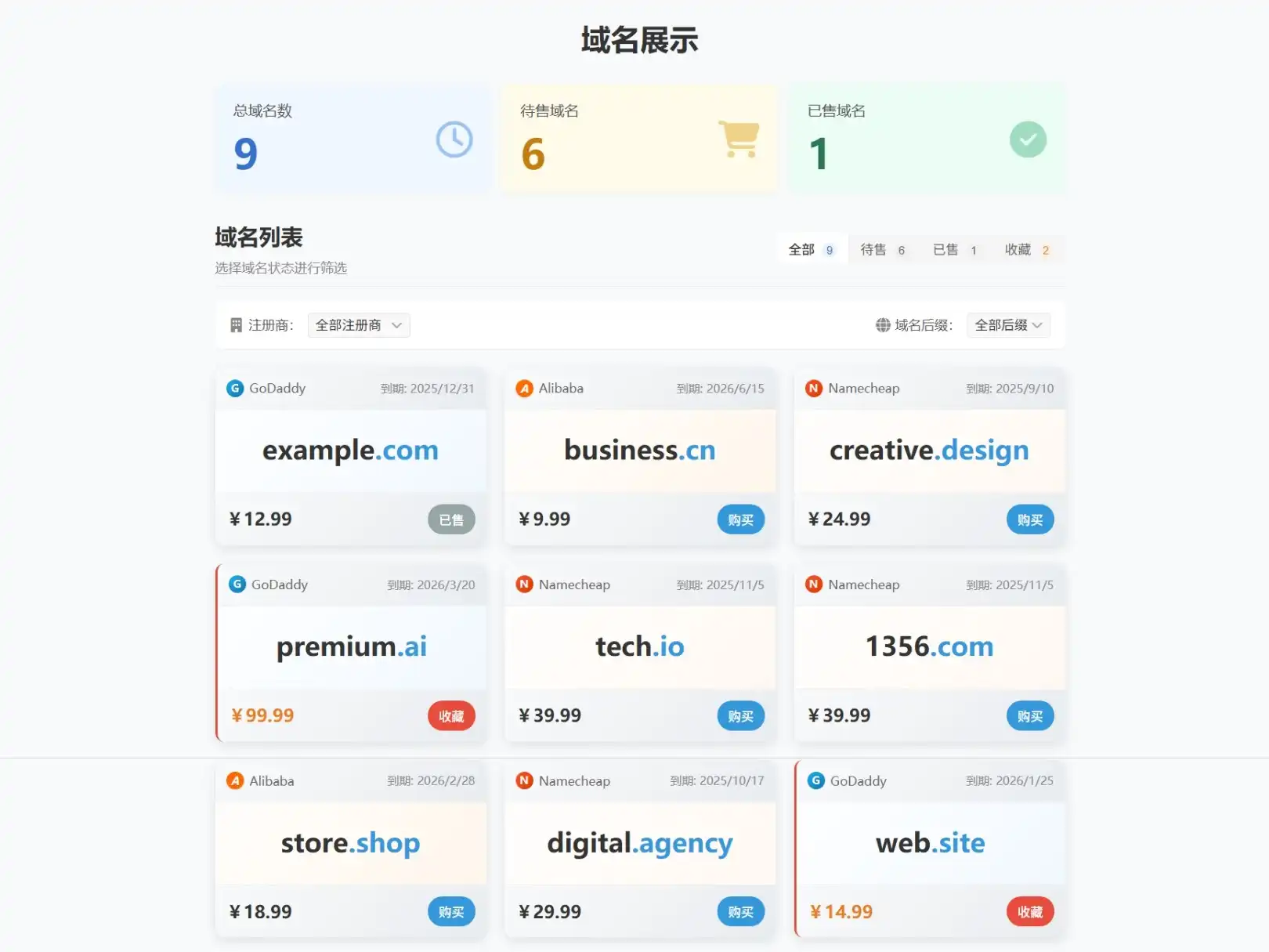 - 为常见注册商(GoDaddy、Namecheap、阿里云、西部数码等)分配了特定颜色